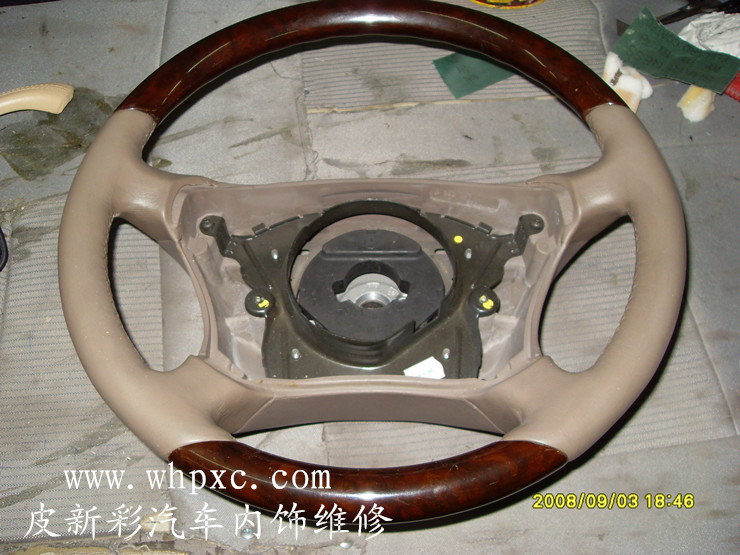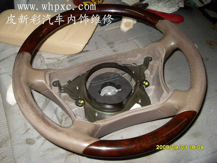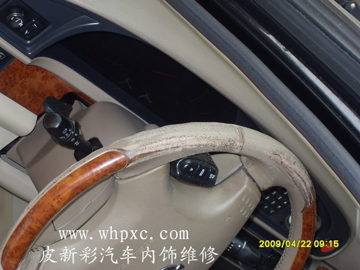 汽車方向盤翻新,真皮方向盤最容易脫色,因為方向盤摩擦得多對上色材料要求很高,要耐濕擦附著力強的材料,上色之后要做好固色和手感處理,皮新彩汽車方向盤內飾維修熱線:13585956565